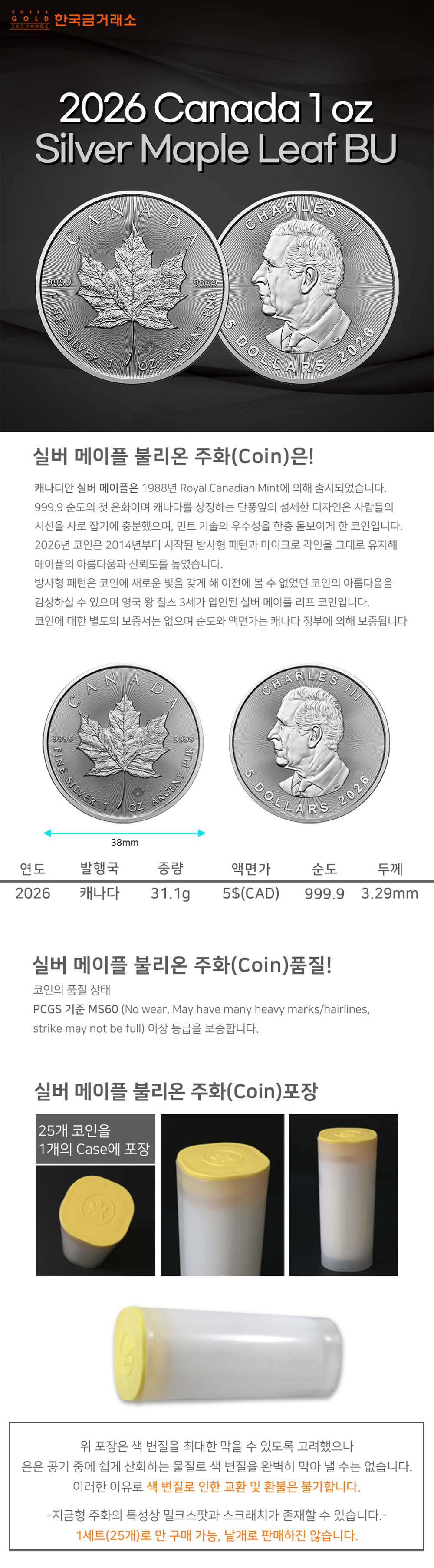 2026 1온스 실버 메이플 불리온 주화(Coin) 5$(CAD) 25ea